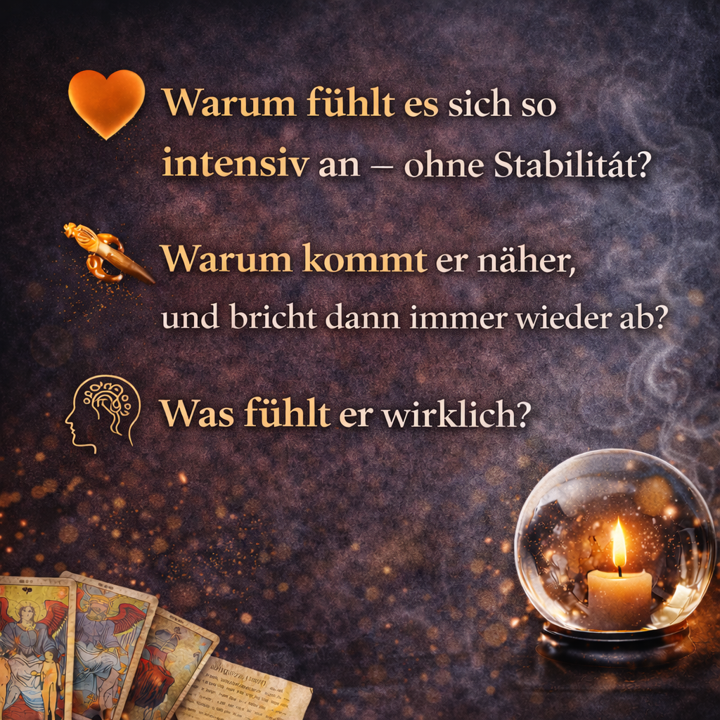 Ich beschreibe sein Gefühls- und Gedankenfeld als Tendenz, abgeleitet aus dem Kartenbild und dem, was du schilderst. Keine absolut sicheren Behauptungen – dafür klare Muster, Indikatoren und Handlungsschritte.